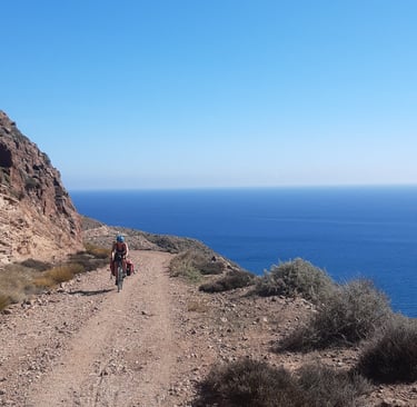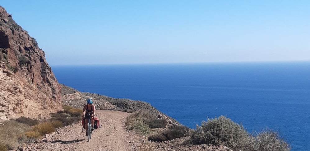 Nous attendions cette étape du Capo de Gata et nous n'avons pas été déçues. De Las Negras une route dans les collines nous a amenées à San José d'où démarre la piste qui fait tout le tour de Capo de Gata. Début tranquille sur une route de terre à proximité de la plage des Genoveses puis les choses sérieuses commencent. Longue montée sur la piste , paysages incroyables, descentes qui font peur, passage au cap puis remontée de ouf sur une route spectaculaire avant de terminer par vingt bornes de plat et l'entrée dans Almeria par les quartiers les moins touristiques qui soient.
