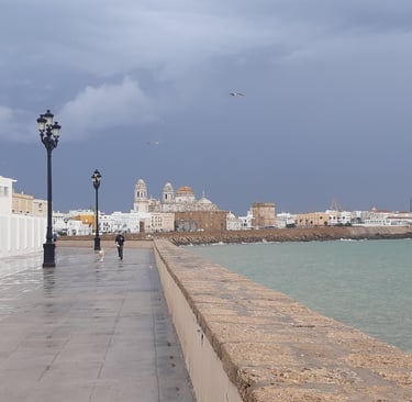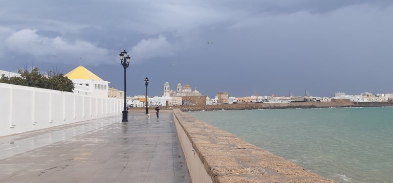 Arrivées mardi soir à Cadix après une étape bien pourrie par la pluie et un peu de scoumoune ! ( le ferry est parti sans nous, sous notre nez.. du coup nous avons pris le train.) Mais nous y sommes ! 1450 km dans les papattes ! Nous nous installons à la Pension Espana, jolie maison ancienne du centre ville historique de Cadix. Nous apprenons alors que des pluies torrentielles et des inondations dramatiques ont fait plus d'une centaine de morts dans la région de Valencia. Le gouvernement a instauré trois jours de deuil national. Il pleut aussi sur Cadix et je décide de rester jusqu'à vendredi matin avant de partir vers Tarifa. Zelda est partie en train pour Barcelone où elle a laissé sa voiture. Son trajet a été compliqué par la situation inédite qui frappe l'Espagne mais elle est arrivée dans les temps .