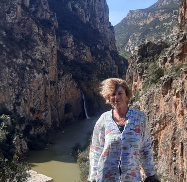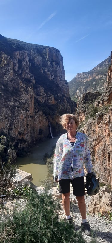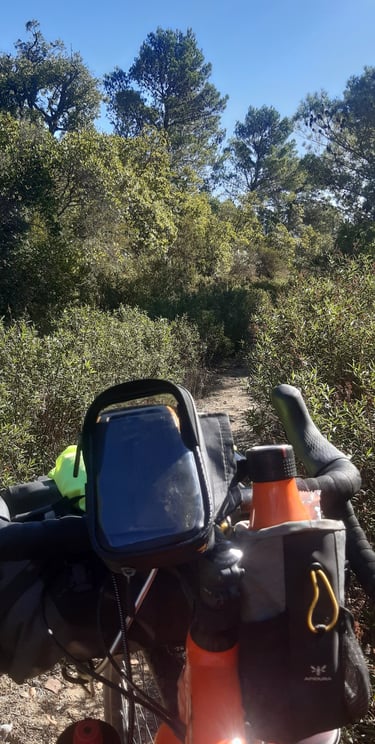 Encouragée par l'itinéraire de la veille je trace à nouveau une route gravel pour descendre à Oued Laou. C'est superbe! D'abord un long passage bien costaud en montagne puis une longue descente VTT et me voici dans les gorges rouges et ocre de Oued Laou. Je retrouve le goudron sur quelques km puis prends une piste en balcon . Elle va en rétrécissant et devient un mince single un peu effondré par endroit. Je tombe sur des places de charbonnières en plein milieu du sentier , je pense à mes amis charbonniers du Vercors et leur adresse quelques photos.